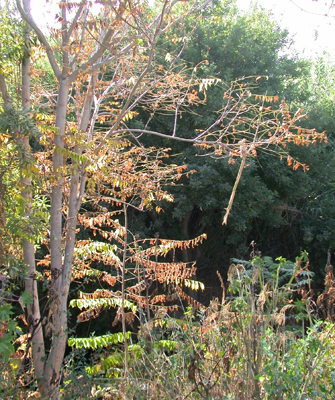 This very invasive tree originally native to eastern Asia was cultivated as a street tree, but it spreads by seeds and by invasive roots. It grows rapidly up to 65 feet tall. In the Basin it invades riparian corridors. |