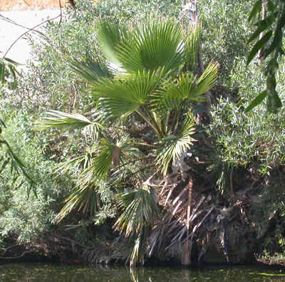 The Mexican fan palm is a common street and landscape tree in the San Fernando Valley. In the fall and winter each tree can produce thousands of oily, black fruits that are very popular with certain birds. The birds eat the fruits and then pass the round seeds. These seeds germinate easily, and little palm trees end up sprouting everywhere, especially in the riparian areas of the Reserve. Another palm tree, the California fan palm (Washingtonia filifera) that is native to desert oases, also is used as a landscaping tree and shows up in the Basin. The California fan palm is considered a weed in the Sepulveda Basin Wildlife Reserve. |